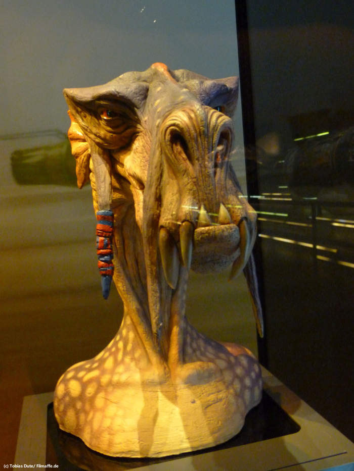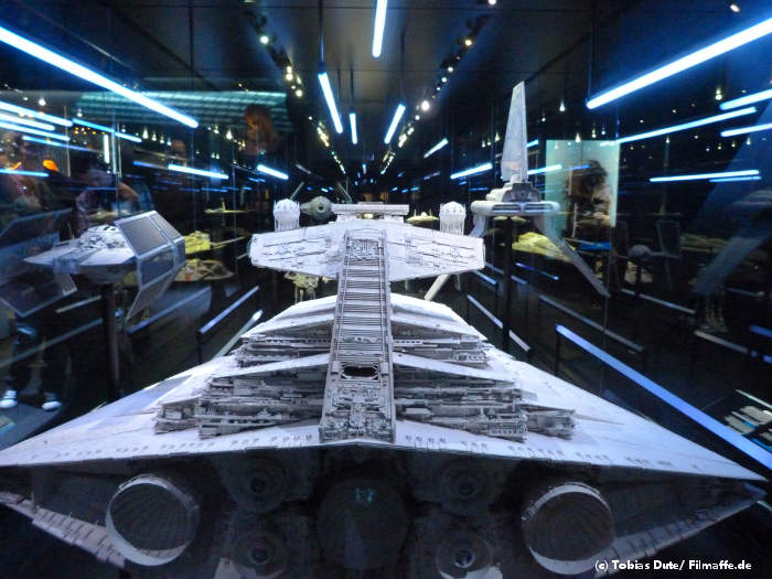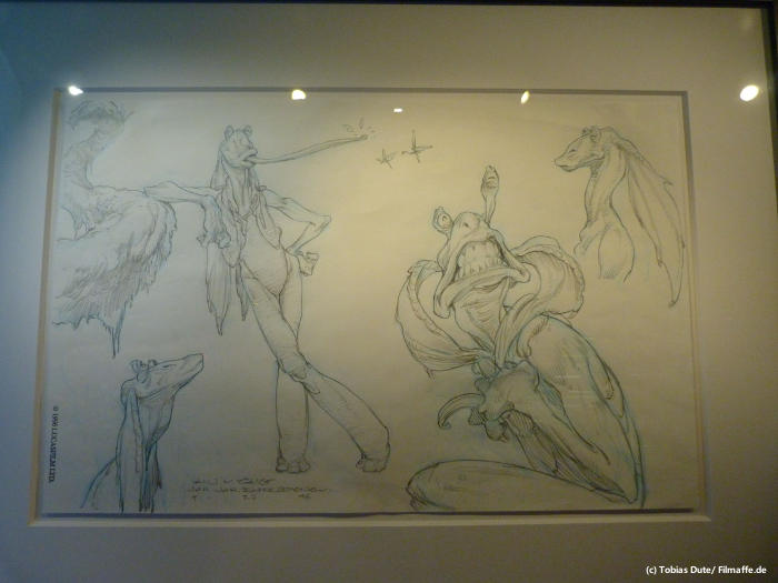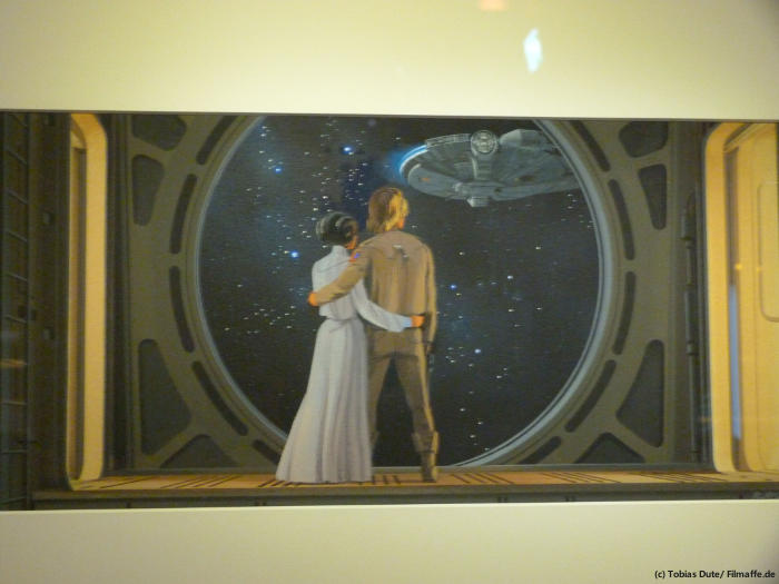 Doch nicht nur Kostüme und kleinere Requisiten zieren das Bild von „STAR WARS Identities“, sondern auch sehr viele Originalzeichnungen für Szenen und Charaktermodelle sind zu bestaunen und sind teilweise wirklich sehr amüsant. Hier sehen wir z.B. die Anfänge von Yoda (den man natürlich auch als Original zu Gesicht bekommt), wo er noch als „Zauberzwerg“ gedacht war, und sich im Laufe der Zeit zu der Figur entwickelt hat, die wir nun kennen. Auch gibt es einige recht große Modelle von Sternenzerstörern, X-Wings und natürlich auch Tie-Fightern zu bestaunen, die durch geschickt beleuchtete Röhren Sprünge in den Hyperraum wagen.