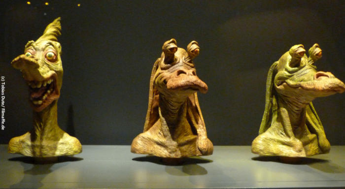 Hat man sich also mit der entsprechenden Hardware ausgestattet, kann es auch schon direkt losgehen und man wird direkt zu Beginn mit tollen Exponaten wie Boba Fett, R2D2 oder auch einigen Kampfdroiden begrüßt. Natürlich sind alle Modelle oder Kostüme auch wirklich die Originale aus den Filmen, man ist also seinen Helden ziemlich nahe. Wenn man sich schon vorher sehr für die Materie STAR WARS interessiert hat, fällt einem sicherlich zu jedem Exponat eine passende Filmszene ein und man schwelgt sofort wieder in Erinnerungen. Die etwas dunklere Beleuchtung und auch die Originalmusik, die hin und wieder vernommen werden kann, bekräftigen die Magie der Ausstellung nur noch mehr. Wenn man dann im Laufe des Besuchs den Podracer von Anakin aus STAR WARS – EPISODE 1: DIE DUNKLE BEDROHUNG in Originalgröße vor sich hat, ist man spätestens hier zum ersten Mal sprachlos.